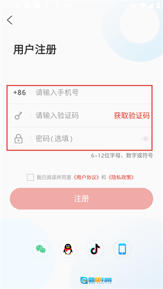 用户在注册页面依次填写【请输入手机号】【请输入验证码】【密码(选填)】这三项内容后,点击注册按钮即可完成注册操作。