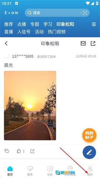 在“印象松阳”页面中,点击底部的“我的”选项,即可进入个人中心页面。