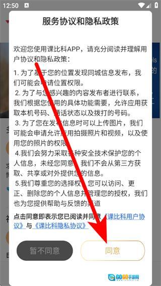 打开课比科,在弹出提示框,点击同意,进入首页。