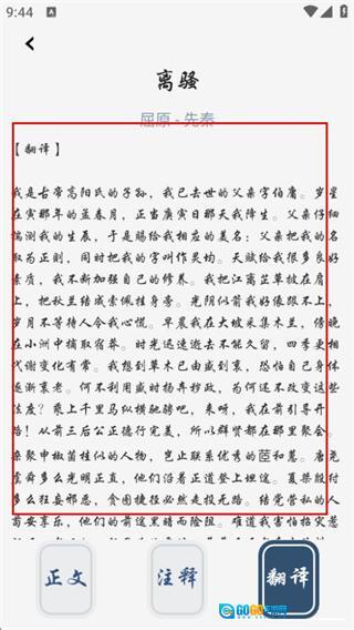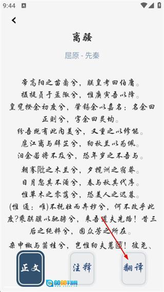 在翻译页面,可阅读离骚对应的完整译文内容。