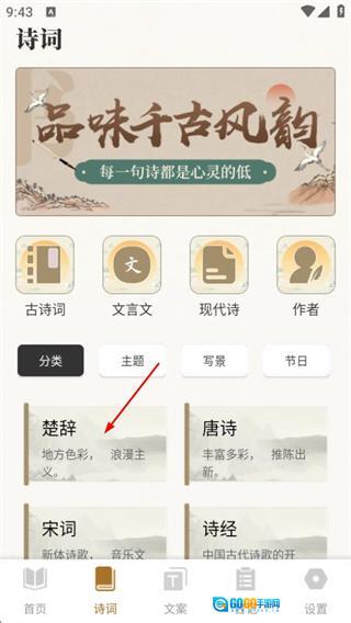 在诗词页面,点击“楚辞”分类,即可进入对应的古诗词列表页面。