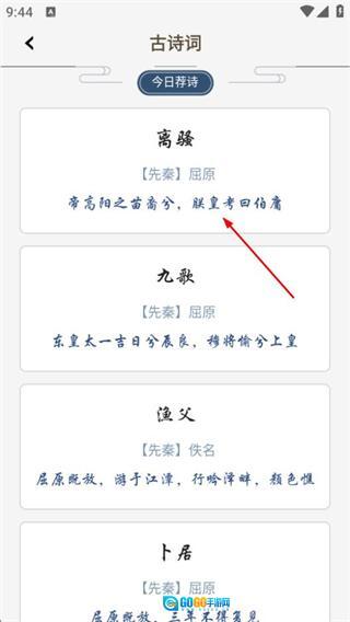 在列表页面,点击目标诗词(例如《离骚》),即可进入该诗词的详情页面。