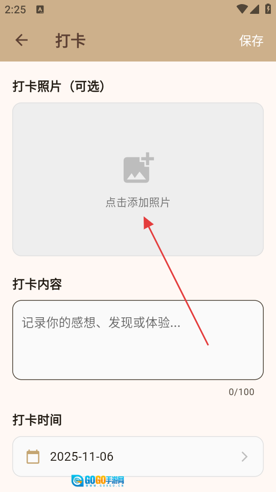 在打卡页面里,你可以点击添加照片,输入打卡内容,全部完成后点击【保存】按钮,这样就能完成打卡了。