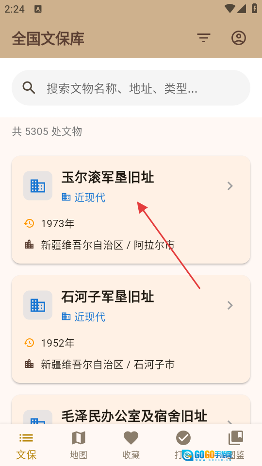 在主界面里,点击【玉尔滚军垦旧址】这一条目,就能进入该文物的详情页面。