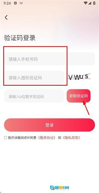 在手机登录界面输入手机号和图片验证码,勾选相关协议后,点击“获取验证码”按钮。