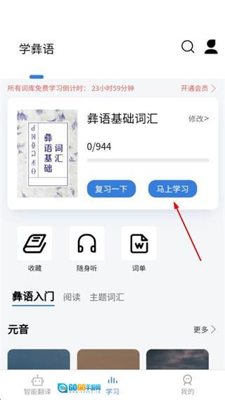 在彝文翻译通的首页,找到页面底部的“学习”选项并点击,即可进入学彝语的页面。