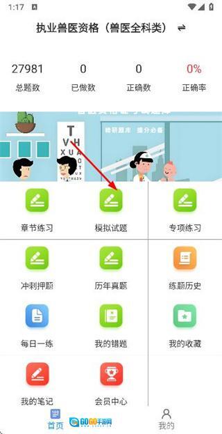 在执业兽医资格首页找到并点击模拟试题选项,即可进入模拟试题分类页面。