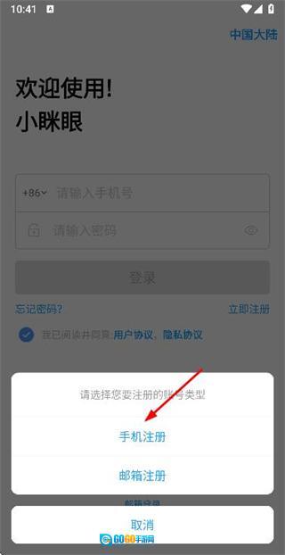 在注册方式窗口选择手机注册,进入手机注册页面。