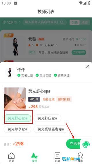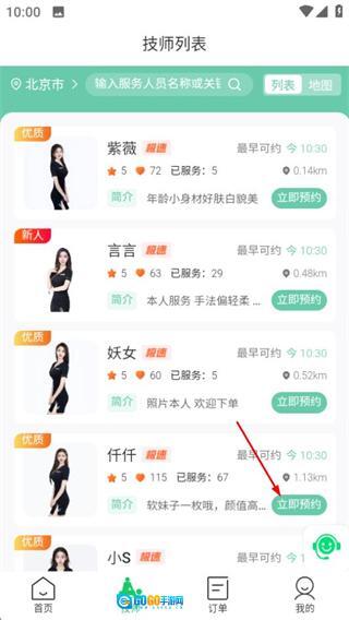 在技师列表页面,选定目标技师后点击“立即预约”按钮,即可进入服务选择页面。