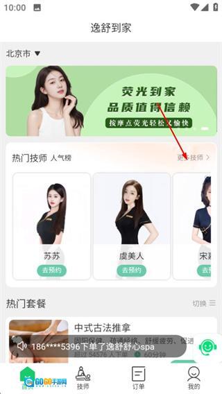 在逸舒到家应用的首页,点击底部的“技师”选项,即可进入技师列表页面。