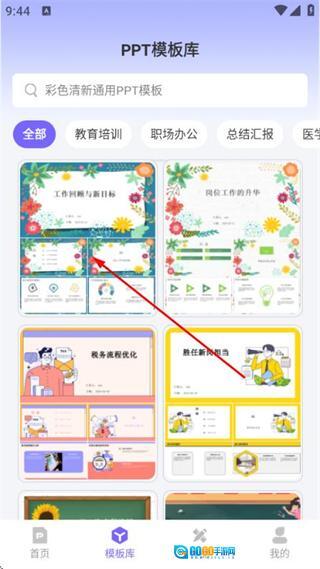 在PPT制作页面的首页,点击底部的模板库选项,即可进入PPT模板库页面。