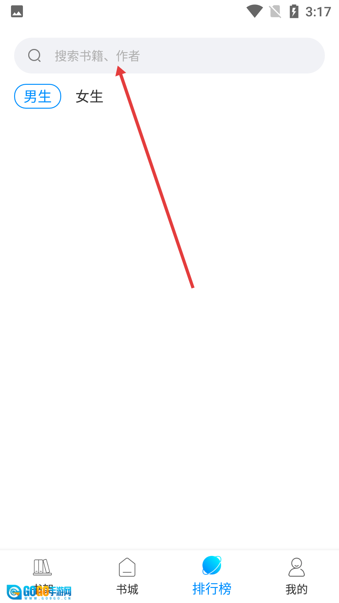 排行榜页点击【搜索栏】,输入关键词准备搜书。