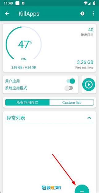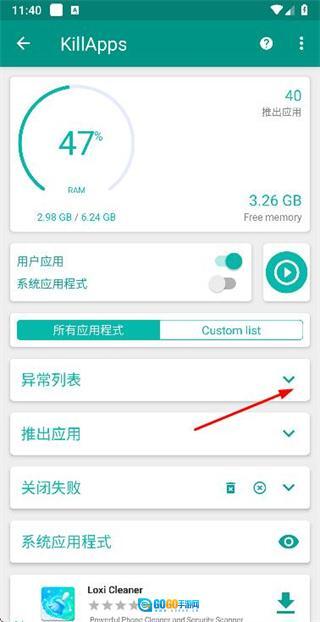 在KillApps页面中,点击异常列表右侧的下拉箭头,即可展开异常列表区域。