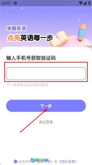 在手机验证登录界面输入手机号码,勾选相关协议后,点击“下一步”按钮以获取验证码。