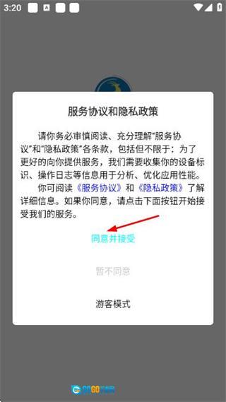 打开软件后,在弹出的服务协议与隐私政策窗口中,点击“同意并接受”按钮,即可进入登录页面。