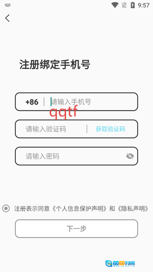在注册页面填写手机号、验证码与密码信息后,点击注册按钮完成操作。