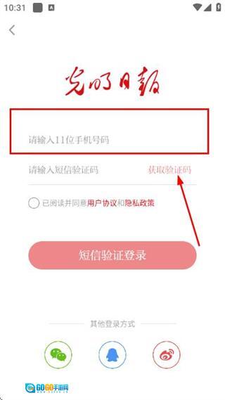 在手机验证登录界面输入手机号,勾选相关协议后,点击获取验证码按钮。