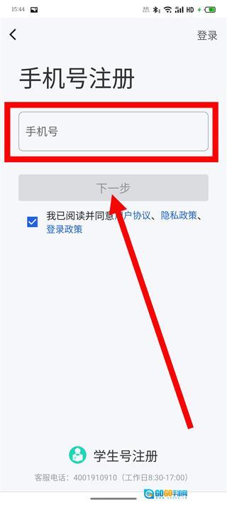 在手机号注册页面,先输入手机号,接着勾选相关协议,之后点击“下一步”按钮。