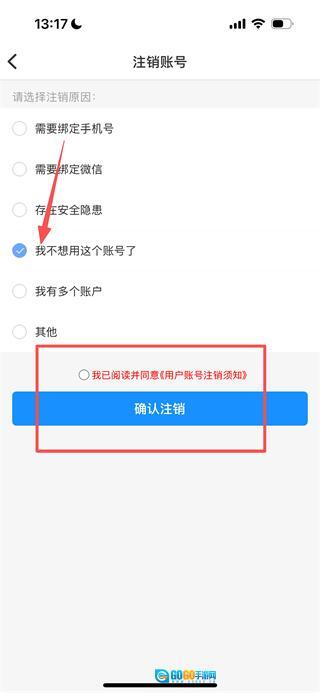 在账号注销页面,先选择注销原因并勾选相关协议,再点击确认注销按钮,即可完成注销操作。