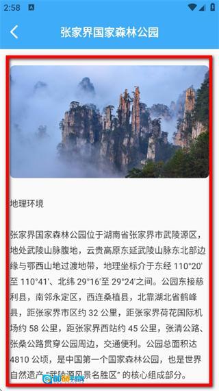 在景点详情页面,能够查看该景点的地理环境、介绍等相关信息。