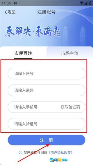 在账号注册页面,先选择“市民百姓”标签,接着填写相关信息并勾选协议,最后点击注册按钮,即可完成账号注册流程。