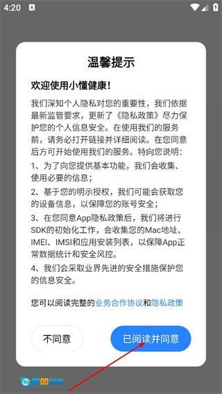 在小懂健康弹出的温馨提示窗口里,点击“同意”按钮后,即可进入医生手机号登录界面。