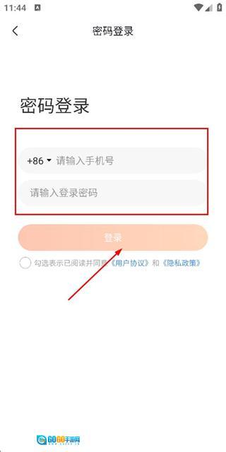 在登录界面输入手机号与密码,勾选相关协议后,点击登录按钮即可完成账号登录流程。
