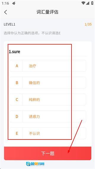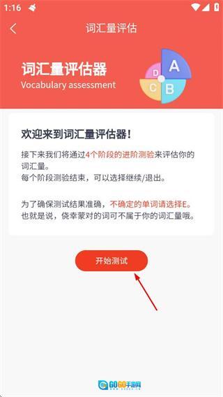 在词汇量评估页面,点击“开始测试”按钮,就能进入词汇量测试环节。