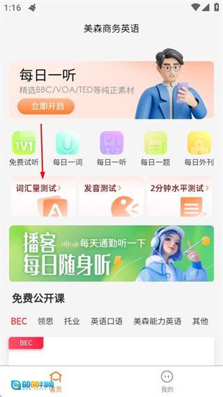 进入美森商务英语后,点击词汇量测试选项,即可进入词汇量评估页面。