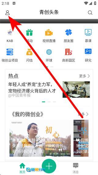 打开青创头条,在主界面点击左上角的头像,这样就能打开侧边栏了。