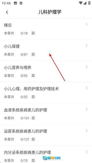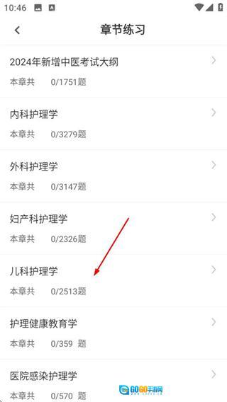 在章节练习页面,选择儿科护理学选项,即可进入相应的章节列表页面。