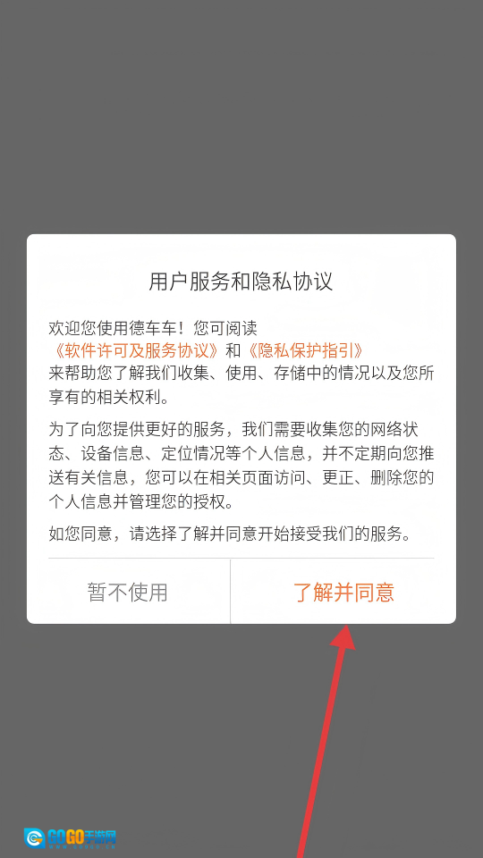 在用户服务与隐私协议的弹窗里,点击【了解并同意】按钮,即可进入德车车主页面。