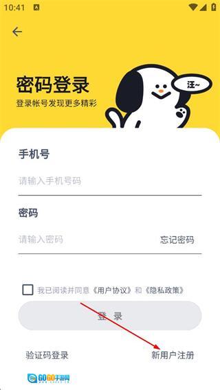 在密码登录界面,点击新用户注册按钮,即可跳转至注册账号页面。