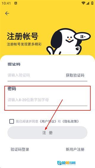 在账号注册页面,按要求填写密码后点击注册按钮,即可完成账号注册流程。