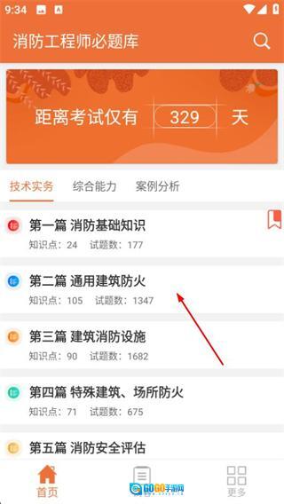 在消防工程师必题库的首页,找到并点击第二篇“通用建筑防火”选项,即可进入该篇章对应的页面。