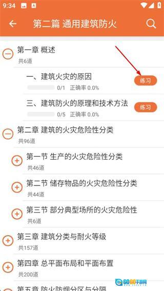 在通用建筑防火页面,找到目标知识点,点击其右侧的练习按钮,即可进入章节练习页面。
