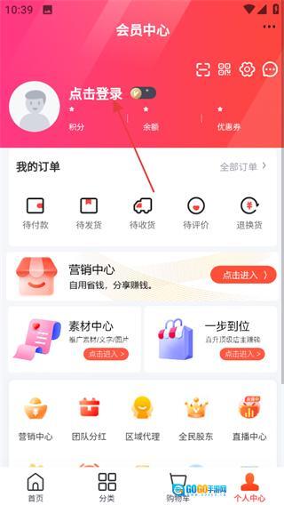 在会员中心页面,点击登录区域,即可进入登录页面。