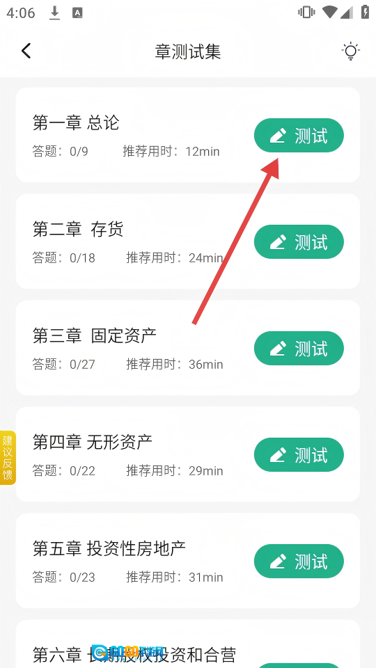 找到【第一章 总论】,点击右侧的【测试】按钮,即可开启该章节的答题环节。