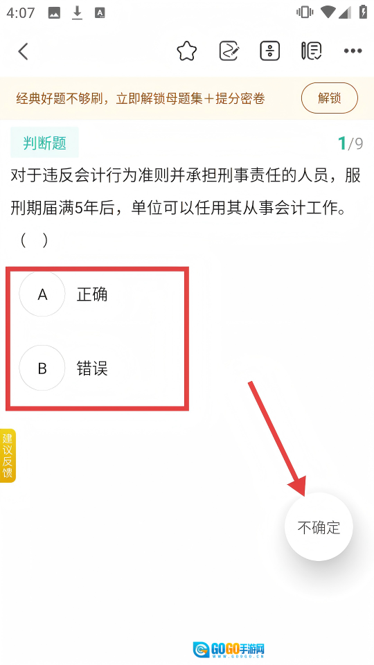 在答题过程中,要是碰到不确定的题目,就点击右下角的【不确定】按钮,把这道题标记起来,方便后续复盘。