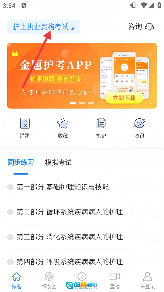 点击顶部的【护士执业资格考试】板块,进入【选择专业】界面,完成考试项目的切换操作。
