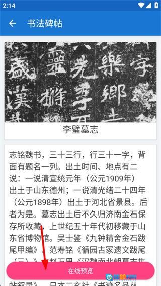 在碑帖详情页面,点击在线预览按钮,就能查看该碑帖的完整内容。