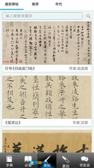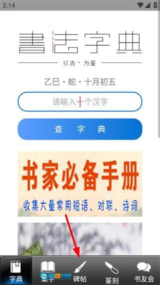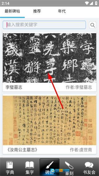 在书法大观的首页,点击底部导航栏中的碑帖选项,就能进入碑帖展示页面。