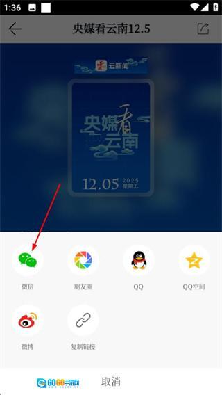 在分享菜单中,选择微信,即可将新闻分享到微信。