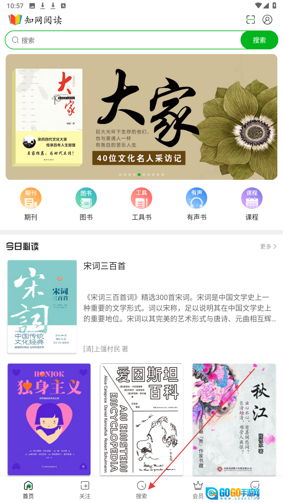 打开【知网阅读】应用后,点击底部导航栏中的【搜索】选项,即可查找期刊、图书等各类资源。