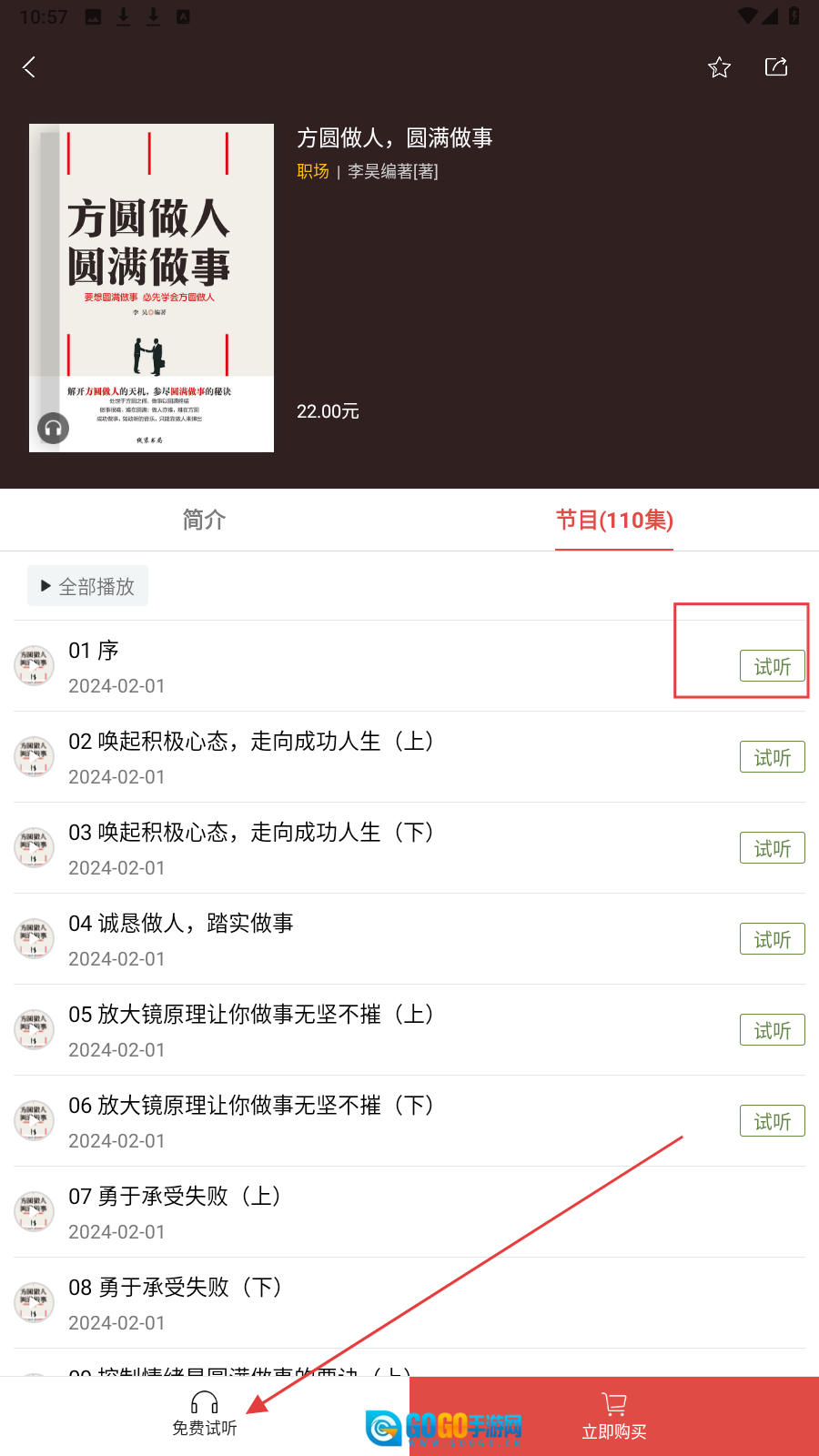 在书籍详情页面设有【免费试听】按钮,点击该按钮即可收听音频内容,从而直观感受书籍的风格特点。