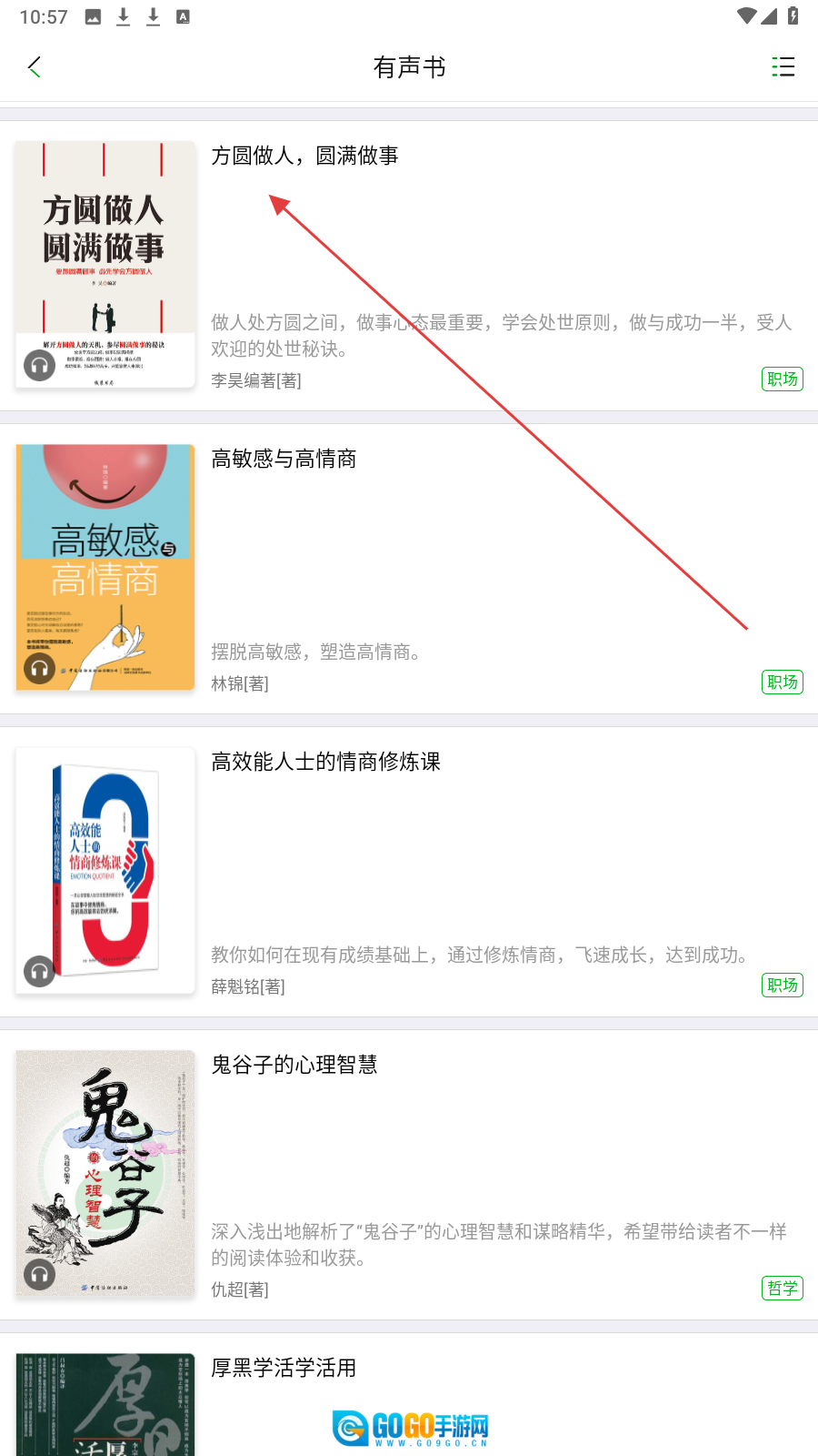 在【有声书】板块中,挑选你感兴趣的书籍,例如《方圆做人圆满做事》,然后进入其详情页面。