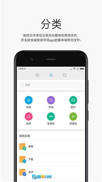 1、按类别轻松浏览文件:文档和数据,图像,视频,音乐,应用程序,和收藏夹。