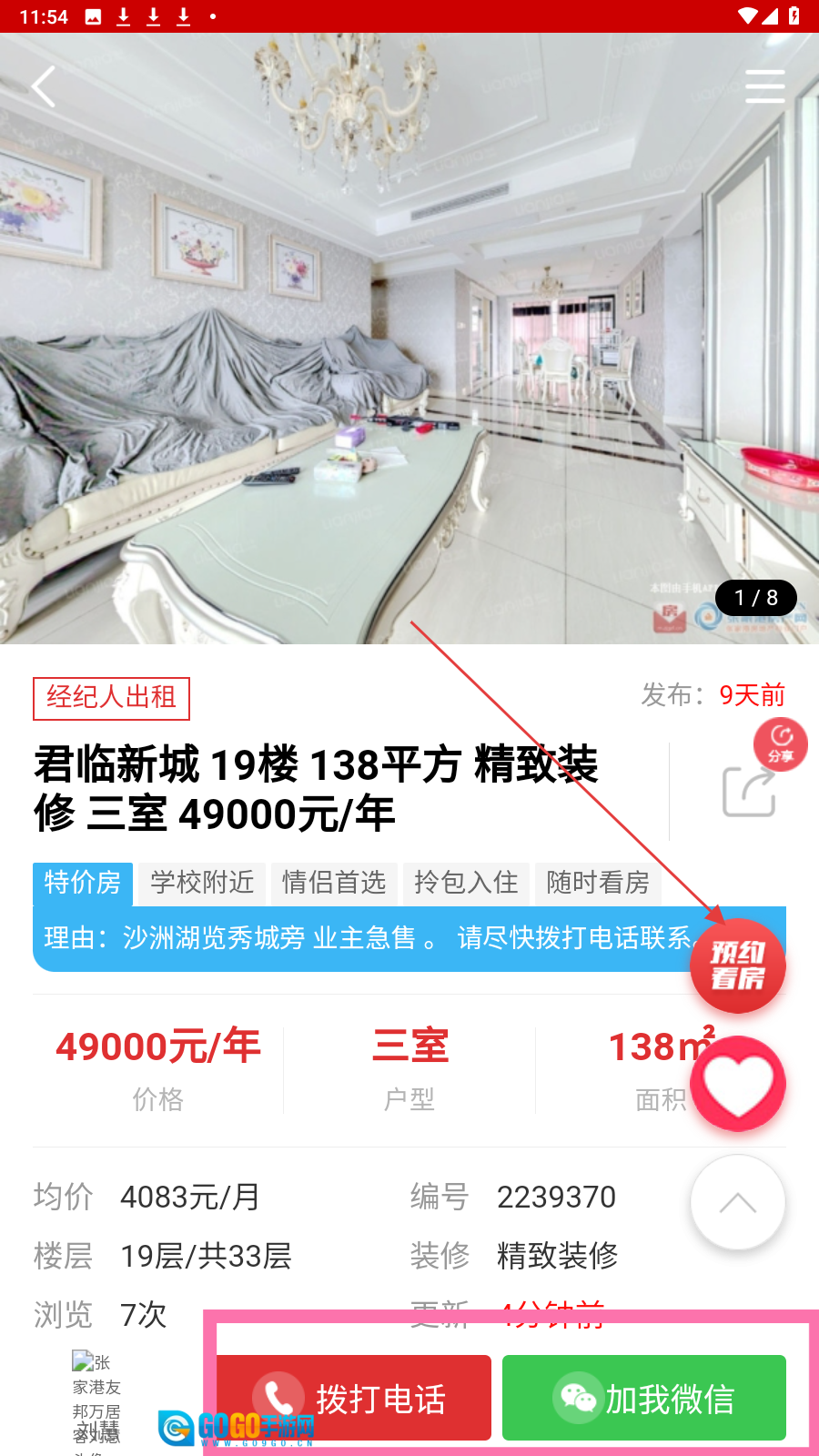 在房源详情页面,您可以点击【预约看房】【拨打电话】或【加我微信】这几个选项,与经纪人取得联系并进行咨询。