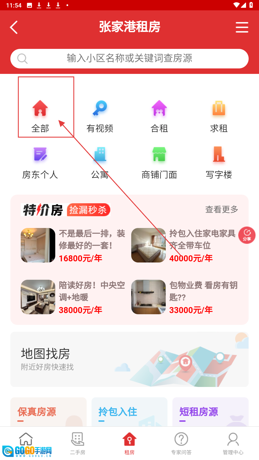 在租房页面中,点击【全部】选项,即可查看所有租房房源的相关信息。