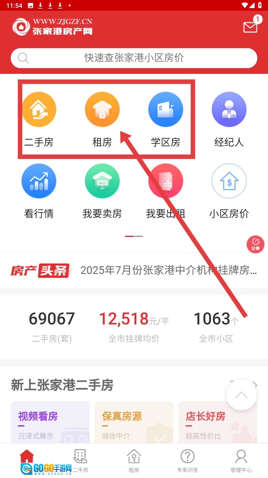 打开【张家港房产网】,点击首页的【租房】图标,即可进入租房页面。